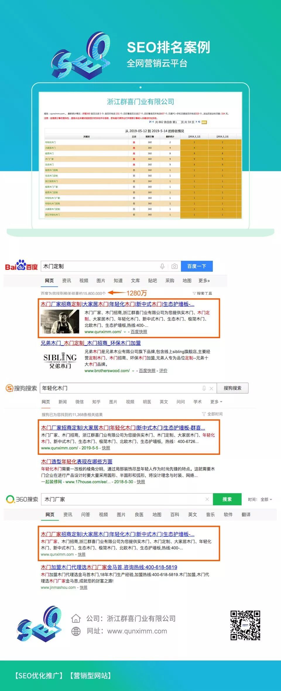 恭喜【群喜木门】开通全网营销云,关键词霸屏百度第一页;利用营销型网站、手机网站、小程序、公众号等实现全网营销!