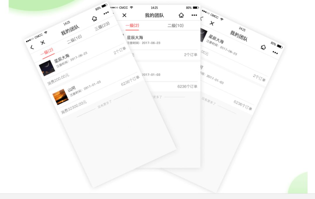 全员分销:为用户提供了无限三级循环的分销模式,企业能够迅速发展粉丝为分销商,以个人为中心,带动周围的需求者参与分销。