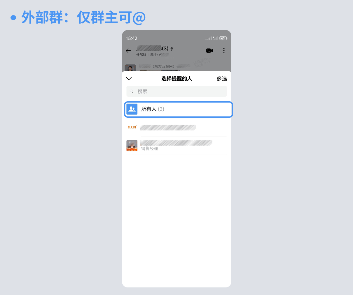 在外部群(包含客户、合作伙伴等外部联系人的群聊)中,权限设置则更为严格。只有群主才可使用@所有人功能,且该功能目前仅支持在手机端操作。